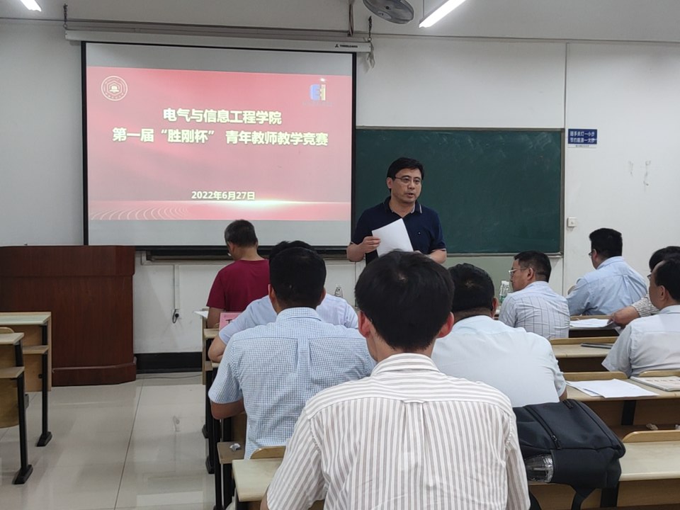 为进一步提升探花视频 广大青年教师的教学能力和业务水平,迎接全省第六届普通高校青年教师教学竞赛,6月27日下午,探花视频 首届“胜刚杯”青年教师教学竞赛在电气楼504举行。本次比赛特别邀请了教务处处长郑啸教授、创新教育学院院长黄志甲教授、马克思主义学院院长高敏教授以及学院教学督导组成员从宏寿、郎佳红老师担任评委,来自电气工程等系室7名青年教师参加了比赛,院长王兵致辞,副院长程木田教授主持。