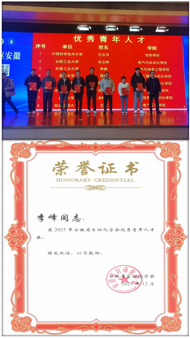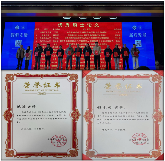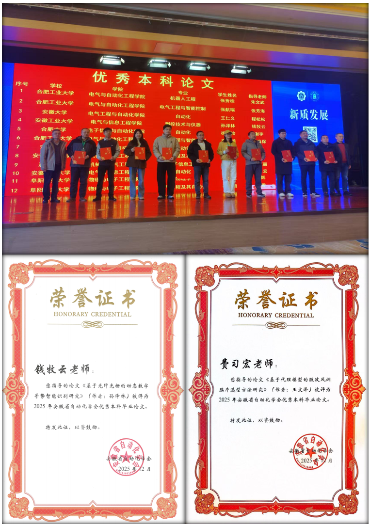 会上发布了2025年度安徽高校自动化专业教育领域的多项奖项,探花视频 喜获安徽省自动化学会优秀硕士毕业论文奖、优秀本科毕业论文奖以及优秀青年人才奖。其中,硕士研究生王雲撰写的《动态未知的马尔科夫跳变系统的强化学习控制研究》(指导教师:沈浩)和蔡国庆撰写的《基于量子相干反馈控制的量子系统动力学演化特性的研究》(指导教师:程木田)获得优秀硕士毕业论文奖;本科生王文泽撰写的《基于代理模型的激波风洞膜片选型方法研究》(指导教师:费习宏)和孙泽林撰写的《基于光纤光栅的动态数字手势智能识别研究》(指导教师:钱牧云)获得优秀本科毕业论文奖;探花视频 青年教师李峰获得安徽省自动化学会优秀青年人才奖。