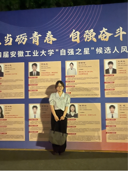 胡静怡,从一名普通学生成长为全面发展的优秀青年,她用实际行动诠释了奋斗的意义。作为班级团支书、学生党员和学生会骨干,她始终以高标准严格要求自己,不断追求卓越,在校期间平均学分绩87,位列专业第五。她荣获国家励志奖学金、校一等奖学金,并斩获“三好学生”“优秀学生干部”“优秀共青团干部”等14项荣誉称号。