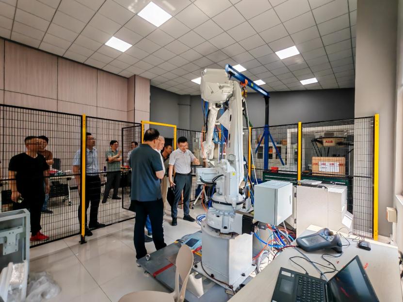 吴江一行首先参观了学院的爱智机器人联合中心,赵卫东详细介绍了中心机器人的技术成果和应用案例,就智能机器人在钢铁制造工艺流程、矿山远程管理技术及其应用与来访专家进行了深入交流。方挺介绍了团队在运用AI视觉技术在各类工业流程中的运用,通过图像处理技术、人工智能算法解决复杂环境下的图像采集、精准识别和精确控制,通过变革传统检测技术的低效率和控制方式,增强各类产线的生产效率和智能化水平;以团队在矿业自动化控制、输电线路故障检测诊断、冷锯定尺切割视觉检测等成功案例,展示了人工智能算法在智慧冶金、智慧生产等方向的应用成果。张辰啸介绍了震动检测在维护大型设备稳定运行等行业成功案例。这些产学研合作典型案例获得了吴江一行专家们的肯定和高度评价。