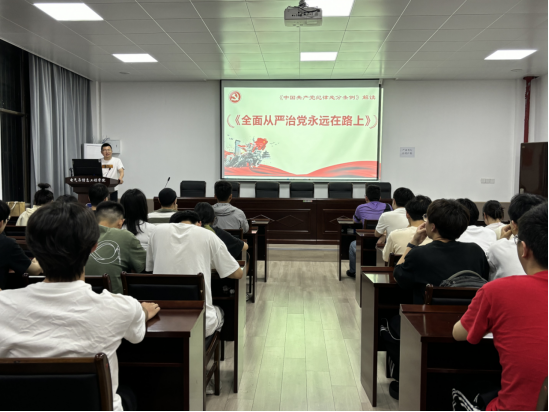 课上,李飞以《全面从严治党永远在路上》为题,讲解了《中国共产党纪律处分条例》的历史沿革以及修订的主要内容,以详实案例进行重点条文的生动解读,从严明政治纪律、组织纪律、廉洁纪律、群众纪律、工作纪律和生活纪律六个方面提出了具体要求。李飞结合警示教育,深刻剖析违纪典型案例,让全体党员受警醒、明底线、知敬畏。他指出,要把自觉模范遵守党规党纪、法律法规、校纪校规和学风考风,作为传承红色基因的实际行动,作为忠诚拥护“两个确立”、坚决做到“两个维护”的现实检验,作为奋进新时代、建功新征程的强大动力。