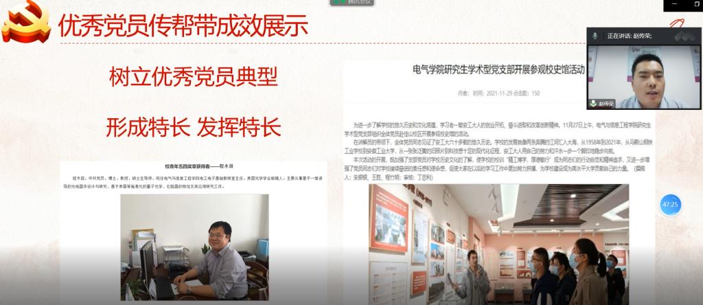 研究生党支部书记赵传荣老师应邀在分论坛-研究生党建发展论坛暨第四届上海理工大学研究生党支部书记论坛,作了题为“以创促建、树立典型,发挥优秀党员的传帮带作用”的报告。