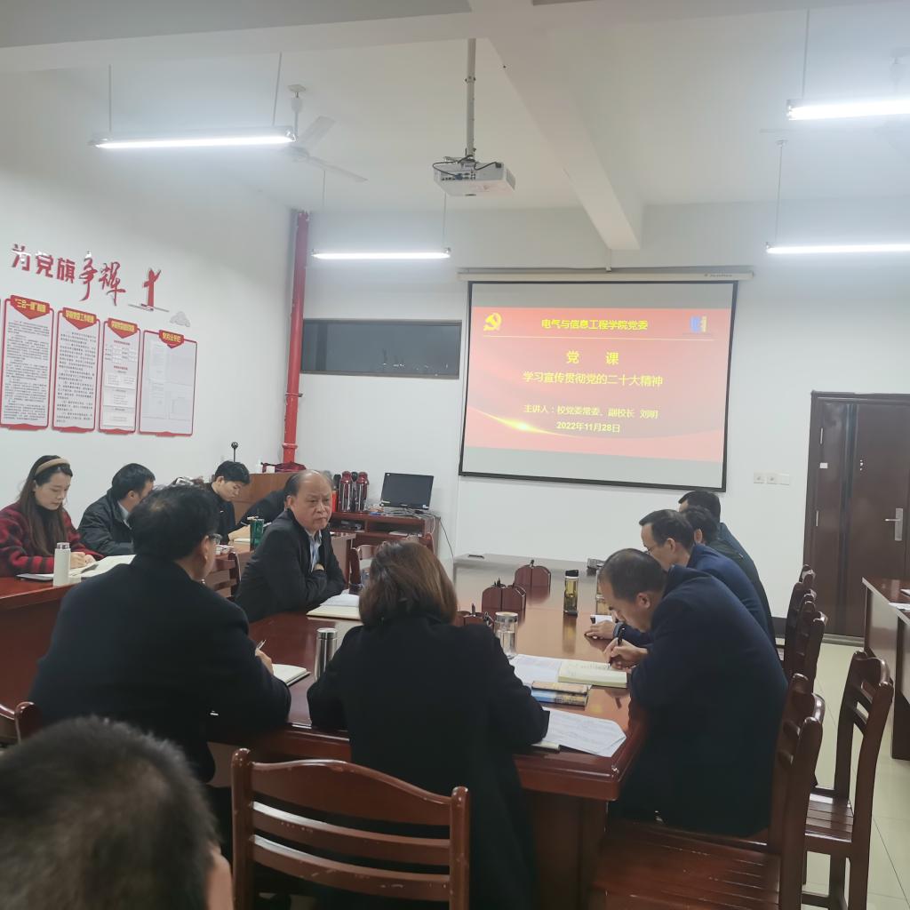 为了深入学习贯彻党的二十大精神,11月28日上午,校党委常委、副校长刘明到电气与信息工程学院宣讲党的二十大精神,学院领导班子、党委委员、支部书记、系主任和科级干部等参加了宣讲报告会,会议由学院党委书记丁忠利主持。