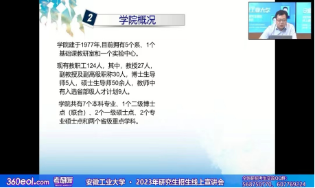 9月7日,分管教学副院长程木田教授专门参加360研究生招生网上直播,面向全国考生开展线上研究生招生直播咨询会,系统介绍学院的研究生招生政策、学科实力、导师队伍、科研平台建设及研究生培养情况。