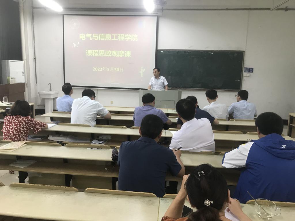 课程思政教学建设工作,5月30日下午,学院在电气楼112教室举行课程思政示范课教学观摩活动。校督导组部分成员、院领导、各系室主任、支部书记和部分老师参加了示范课教学观摩活动,活动由教学副院长程木田主持。