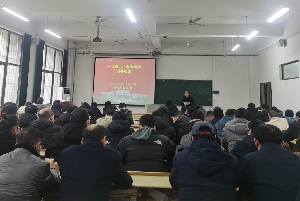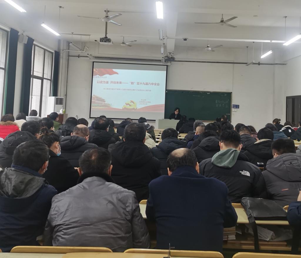 邀请校党委讲师团成员、马克思主义学院牛云芳博士来院作党的十九届六中全会精神专题宣讲报告,学院全体教职工、学生代表等参加报告会,学院党委书记丁忠利主持报告会。