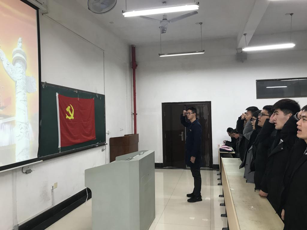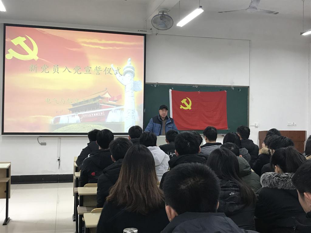 于电气楼113教室举行新党员入党宣誓仪式。院党委副书记郭宏、各学生党支部书记、各年级辅导员、2018年下半年新发展的党员以及全体学生党员参加了仪式。仪式由学生自动化党支部书记张敏主持。