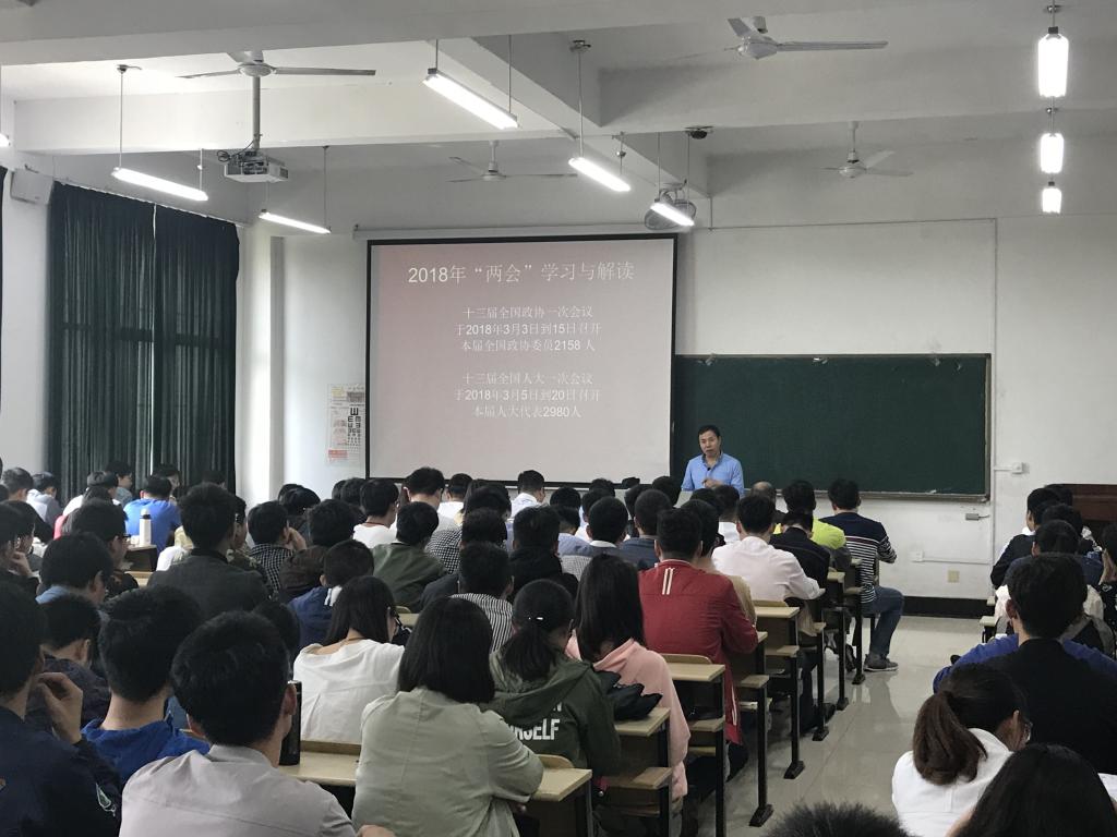 宋洪生从“何为两会”“两会的时间、议程”开篇,讲述了两会的热点与重点,解读了宪法修改、监察改革、体制改革、领导换届,并详细讲解了政府工作报告。宋老师的讲课深入浅出,简明扼要。他用精彩的实例和独到的分析,让师生们更加深入理解两会的精神与内涵,为大家进行了一次思想上的洗礼,赢得了师生们的阵阵掌声。