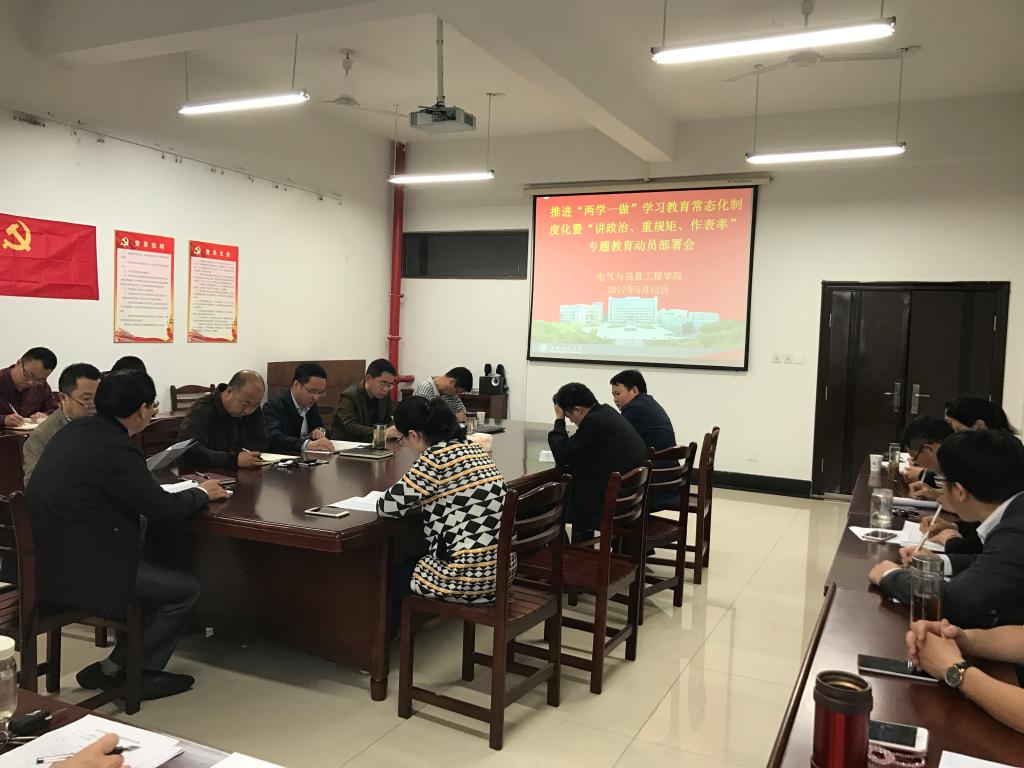 5月12日上午,电气与信息工程学院在电气楼304会议室召开党委中心组理论学习(扩大)会,就认真推进“两学一做”学习教育常态化制度化暨“讲政治、重规矩、作表率”专题教育工作作动员部署。学院党委中心组成员、各系室中心主任参加会议。会议由院党委书记叶凤华主持。