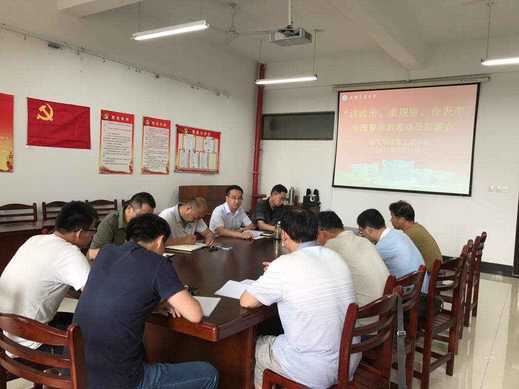 委员会关于印发<关于在全校党员干部中开展“讲政治、重规矩、作表率”专题警示教育的方案>的通知》(安工大党〔2017〕50号)文件精神,并对学院及各党支部接下来要开展的工作进行了动员部署。