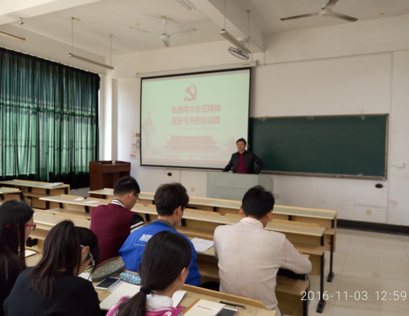 在会议之前,支部成员观看了《永远在路上》专题片,支部党员充分认识到了党中央反腐倡廉,从严治党的决心和力度。随后支部书记孔洋波首先带领党员认真学习了习近平总书记“纪念中国红军长征胜利80周年”重要讲话精神,并通过习总书记在讲话中提到的四个“伟大远征”即理想信念的伟大远征、检验真理的伟大远征、唤醒民众的伟大远征、开创新局的伟大远征,与大家共同回顾了长征对中国革命的重要意义,并要求大家深入体会“长征精神”。