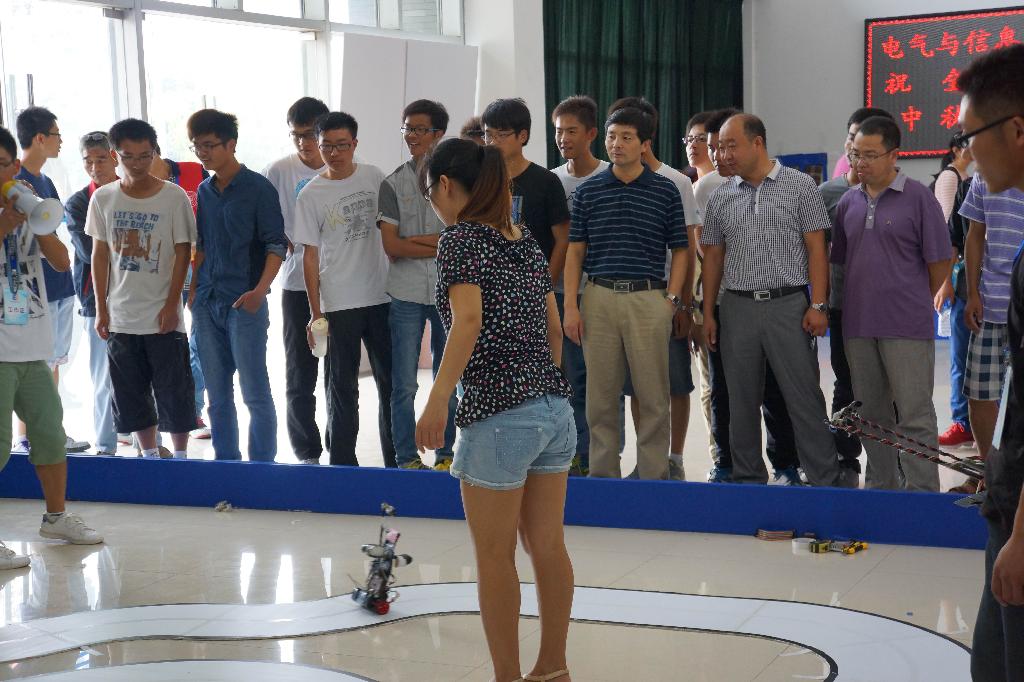 展览现场,精巧的智能车在黑白相间的赛道飞速行驶,活泼可爱的机器人在展台跳着动人的舞蹈,“萌宠”似的灭火器圆满地完成了自己的任务,琳琅满目的科技制作陈列以独特的造型,实用的功效吸引了众多师生前来参观。作品创作者为大家进行现场解说,并进行现场模拟演示作品功用。很多同学都由衷地发出感慨,觉得“牛人就在身边”。本次展出的科技创新作品,都是学院大学生科技创新团队中精挑细选出来的,每件作品都凝结了创作学生的聪明才智和辛勤汗水,也展现了电气信息学院大学生紧扣时代脉搏的创新精神和创新能力。