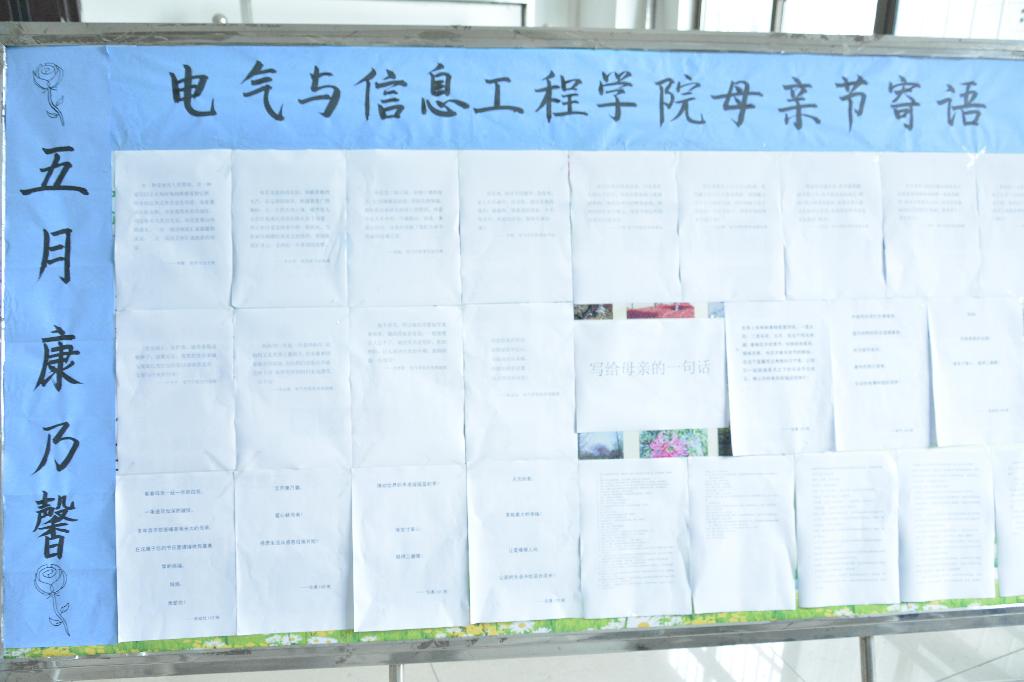 通过制作宣传母亲节展板、悬挂横幅等方式积极营造感恩母亲的良好氛围。学院各年级的同学各显才能,通过给母亲的一封信,母亲节寄语,精美的祝福卡片以及“情浓五月天,感恩母亲节”集体签名等活动表达大家对母亲的深深祝福和思念,一系列活动也让工大的校园里弥漫了满满的温暖和感动。