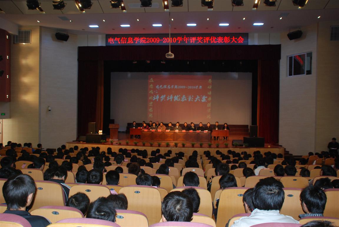 12 月6 日 下午,电气信息学院 2009-2010学年度学生评奖评优表彰大会在东区新大学生活动中心隆重召开。校党委副书记汪光阳,校关工委主任李明,学工部部长陈选华,校团委书记方华,电气信息学院党委书记孙世民、院长赵光兴、副院长张捍东、刘晓东、姚敏,各系室负责人及班主任老师参加了会议。会议由学院党委副书记姚敏主持。