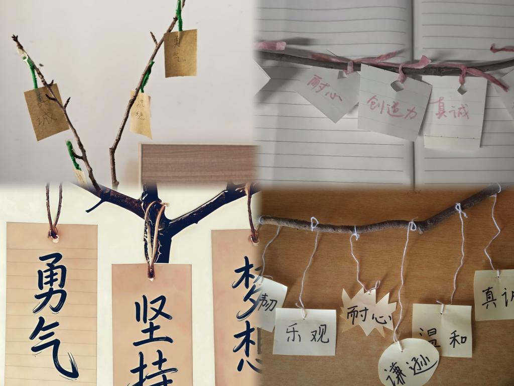 活动中,同学们走进自然,寻找一根形态清晰、筋骨分明的树枝作为创作载体。这些在冬日中依然保持向上生长姿态的树枝,象征着生命在逆境中的韧性和希望。随后,同学们在纸上写下代表自身核心力量的关键词,将其与树枝相结合,并以红绳系于枝干节点处。这些节点既是树木生长的印记,也成为同学们内心力量的视觉坐标。通过这一创意过程,普通的树枝化身为承载个人成长故事的“内在力量树”,帮助学生在审视自我中梳理已有资源,获得持续的情感支持。