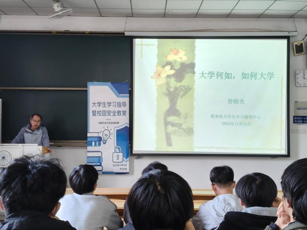 为帮助2025级新生科学规划大学生活、筑牢校园安全意识,11月15日晚,学院在教一115教室举办“大学生学习指导暨校园安全教育”主题讲座。活动特邀教务处曾晴光老师担任主讲,辅导员蒋安东主持,气255班全体同学积极参与。