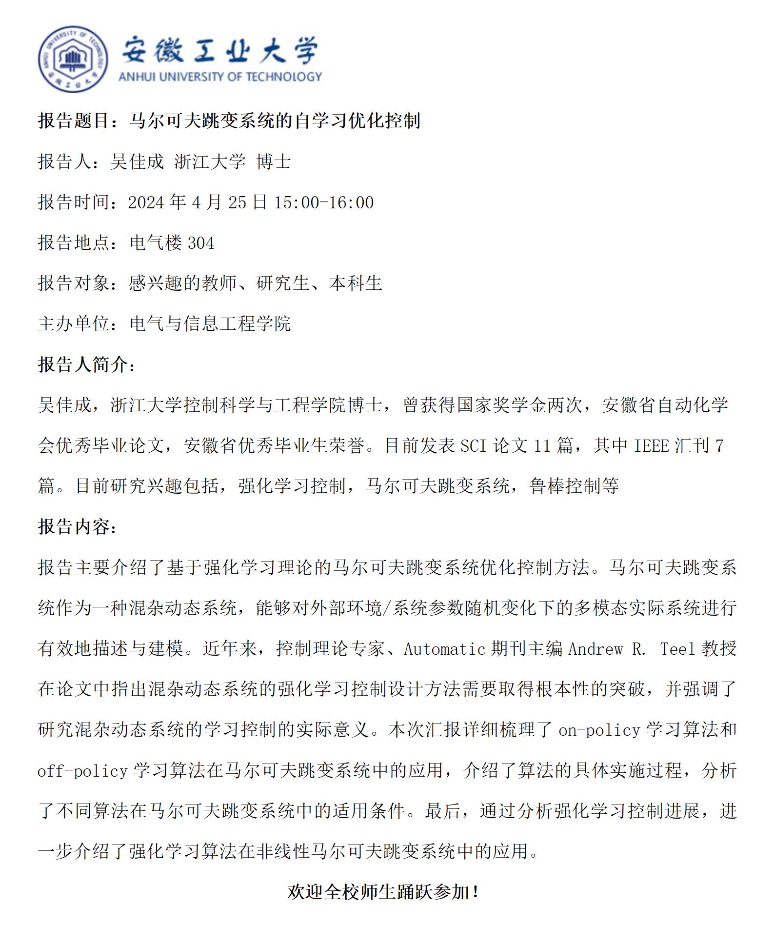 砺山学术报告之三十四-马尔可夫跳变系统的自学习优化控制