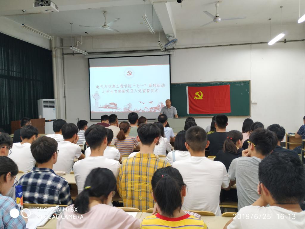 于电气楼112室举行新党员入党宣誓仪式。院党委副书记郭宏、各学生党支部书记、各年级辅导员、2019年上半年新发展的党员以及全体学生党员参加了仪式。仪式由学生自动化党支部书记张敏主持。