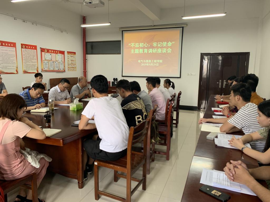 “不忘初心、牢记使命”主题教育实施方案的工作部署,9月29日下午,学院党委召开“不忘初心、牢记使命”主题教育调研座谈会。院党委书记叶凤华、院长王兵、院党委副书记郭宏、各年级辅导员以及来自各年级的15名本科生、研究生代表参加了会议。会议由郭宏主持。