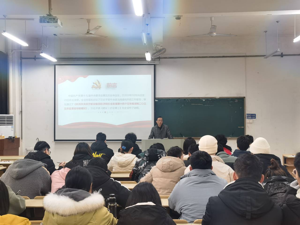 党委书记丁忠利在电气楼112,以《党的十九届五中全会精神解读》为题,为学院2021年3月份发展对象班学员上了一堂深刻生动的党课。