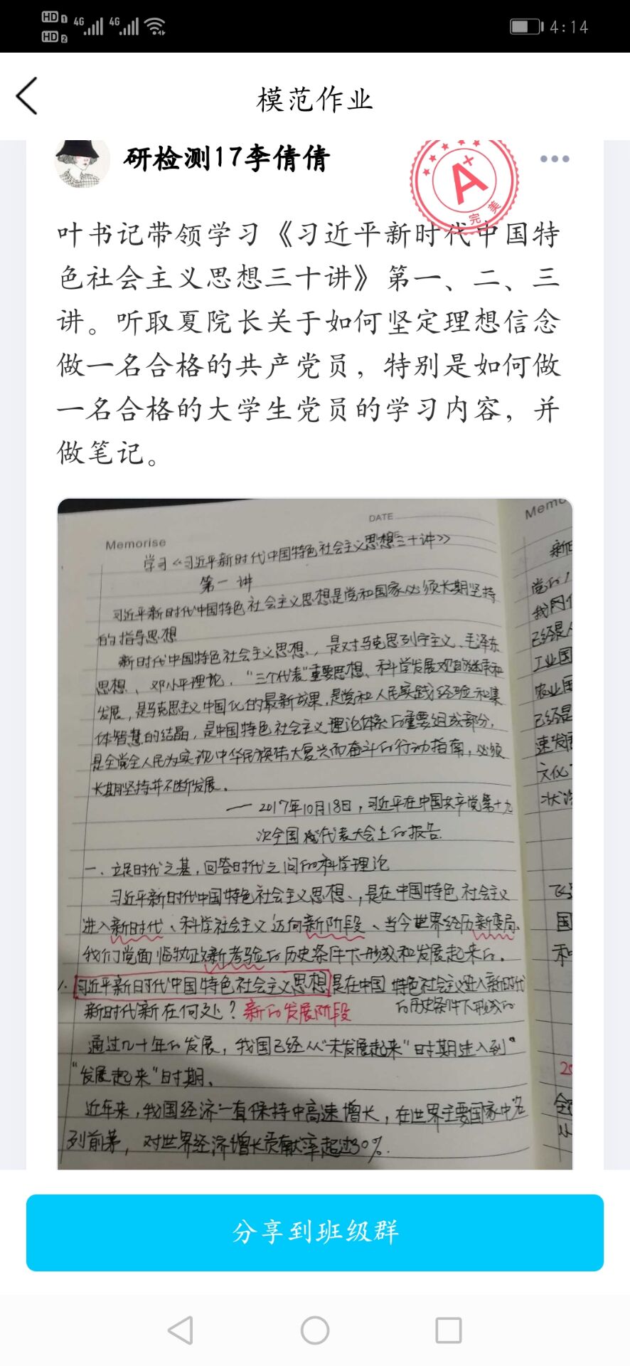 评比前,分党校班主任利用班级QQ群中的作业功能布置上传笔记图片任务,参加培训的53名学员按时全部上传了自己的笔记。评比中采取集中观摩、线上点评等方式进行,标准突出表现为三个方面:一看线上课堂内容把握情况,重点看学员对于线上培训内容是否记得齐全;二看书写认真规范程度,重点看学员书写是否认真细致;三是看学员态度及思想状况,重点看笔记后是否有思考小结、是否有心得体会。一张张学习笔记图片,书写工整,字迹娟秀,充分展现了学员积极学习、乐于思考、认真细致的"精气神"。线上点评的过程中,学员们纷纷表示:写笔记不止是一种形式,更是一种精神,一种热忱,一种感悟,不仅用传统方式让大家重温了书写的乐趣,也在记录的过程中提升了自己的理论水平。