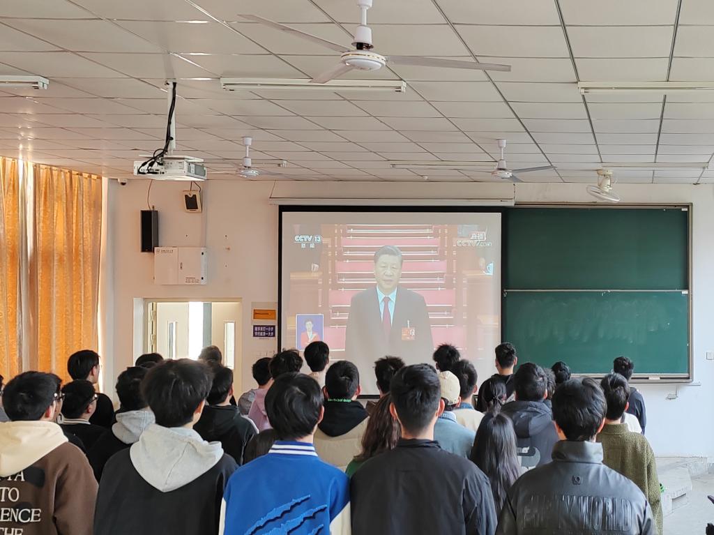 在佳山校区教一101教室组织辅导员、学生干部和入党积极分子代表集中收听收看十四届全国人大一次会议开幕会直播盛况。