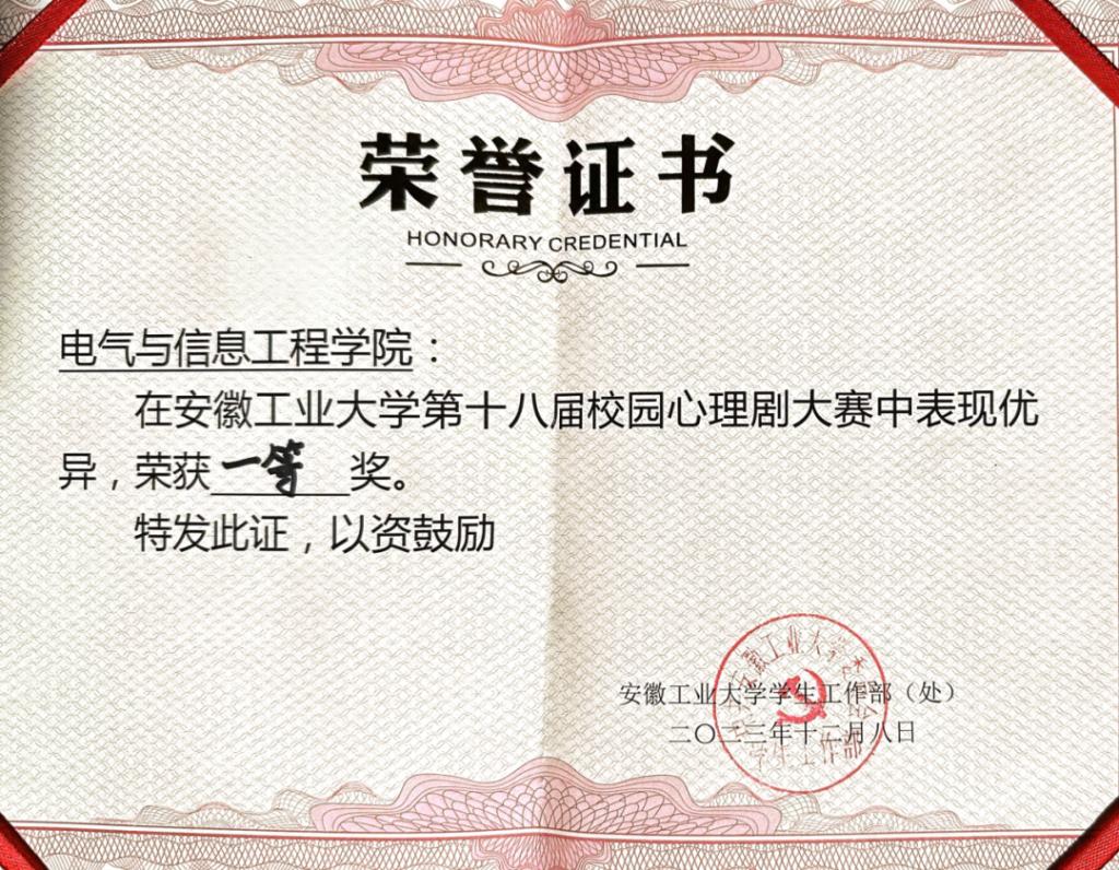 仪231班同学自编、自导、自演作品《溯》荣获“校级心理话剧一等奖”。