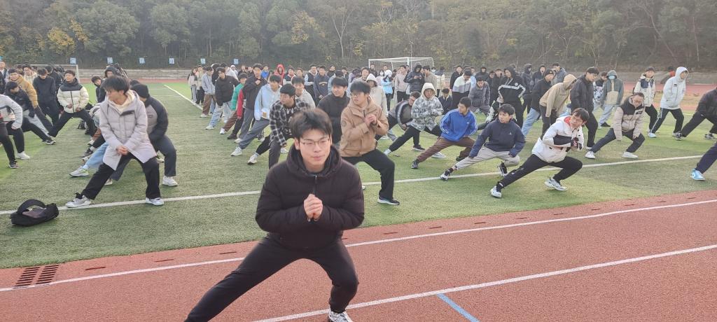 23级全体新生及辅导员老师在活动横幅上签下自己的名字,这一庄重而又热烈的仪式感激发了同学们的集体荣誉感。冬季的早晨气温较低,为了防止感冒和运动伤害,晨跑前老师带领同学们转动脚腕,活动膝关节,为跑步做好热身。接着,在辅导员和学生会成员的带领下,600余名同学迈着有力的步伐,呼吸着清冷的空气,迎着初生的朝阳,一起在新田径场开始了乐跑锻炼,开启了元气满满的一天。他们的脸上洋溢着健康的红润,流露出对生活的热爱和对体育的执着。尽管寒风凛冽,他们依然坚持在操场上,尽情挥洒汗水,释放青春的活力。
