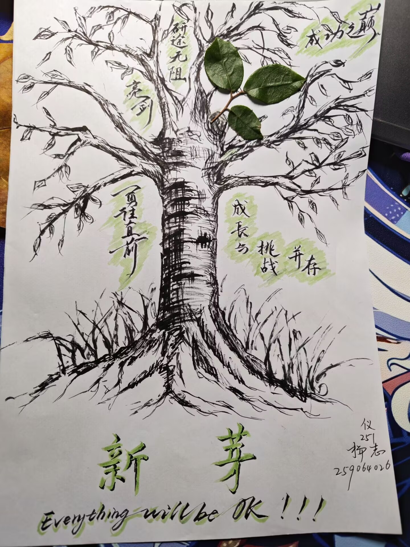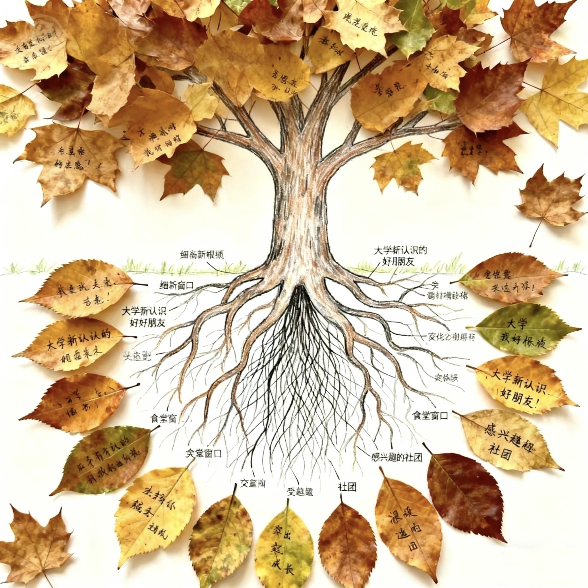 活动通过“落叶寄情—树干立根—根系绘新”三个环节,引导学生进行阶段性总结与规划。同学们首先挑选或手绘一片落叶,书写对高中生活的怀念、对师长亲人的感恩或对过往的告别;随后在纸张下半部分勾勒代表成长根基的树干;最后围绕树干绘制细致根系,并在根须上标注进入大学后新结识的朋友、常去的食堂窗口、感兴趣的社团等新鲜体验,以此融合回忆与当下,滋养内心成长。