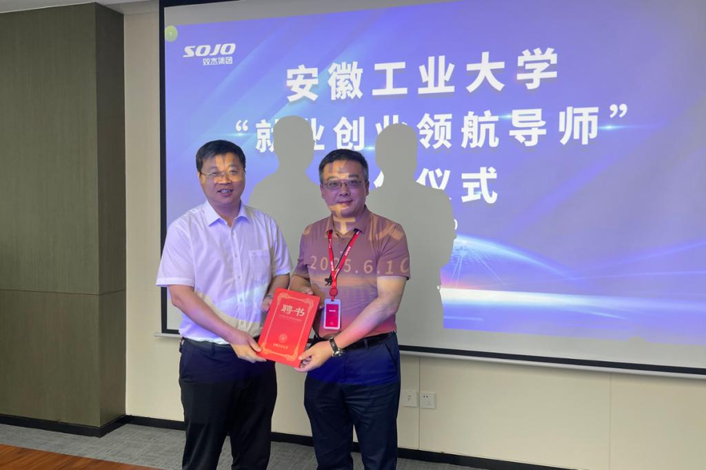 期间,学校就人才培养、实习实践基地建设、产学研合作等方面与企业进行了深入交流。王俊代表学校为双杰电气合肥有限公司总经理殷华新、人力资源总经理洪峰颁发了“就业创业领航导师”聘书,为合肥维信诺科技有限公司授牌“大学生就业基地”,并签订了人才培养与就业基地建设合作协议。