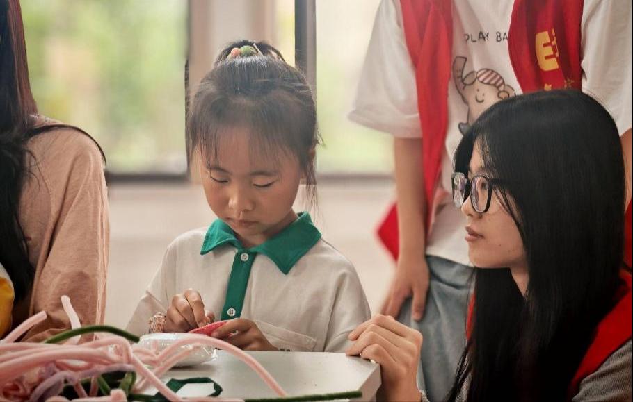 图为志愿者帮助小朋友完成手工
