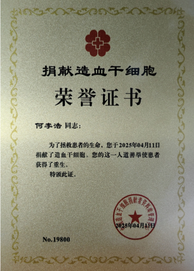 2023级电子信息专业的学生,2023年10月刚入学后不久,何李浩在参加校园无偿献血活动中了解到捐献造血干细胞救助他人的意义后,毅然留样加入中华骨髓库,留下当代大学生的大爱精神和青春担当,而这份爱心的实现在大家共同的努力下,一年半后就开花结果。