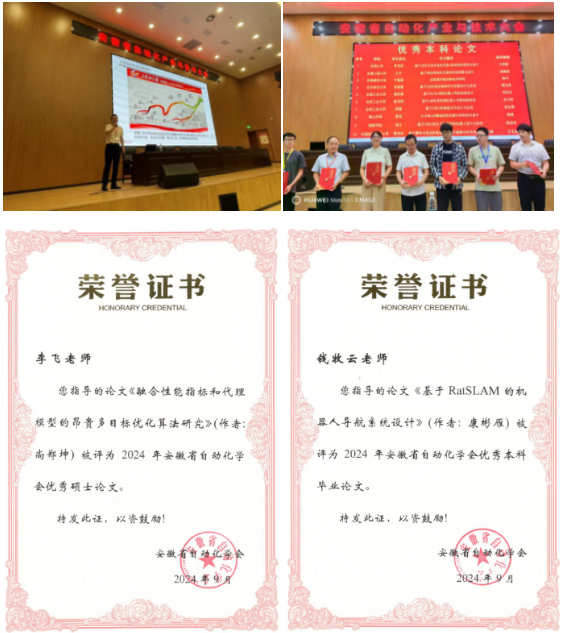 硕士研究生尚郑坤撰写的论文《融合性能指标和代理模型的昂贵多目标优化算法研究》(指导老师:李飞)和本科生康彬燕撰写的毕业论文《基于RatSLAM的机器人导航系统设计》(指导老师:钱牧云)分别获得安徽省自动化学会优秀硕士论文奖和本科毕业论文奖。