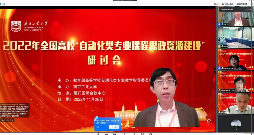 自动化专业的课程思政建设,进一步发挥课程思政示范课程在一线教学中的引领作用。11月26日,2022年全国高校“自动化类专业课程思政资源建设”专题研讨会在厦门举行,学院高度重视,专门组织了自动化及相关专业教师参加线上会议。本次会议由教育部自动化类教指委组织,旨在探讨自动化类专业课程思政示范课程的数字化资源建设内容和标准规范,推动自动化专业人才培养更好地满足社会经济发展的需要。